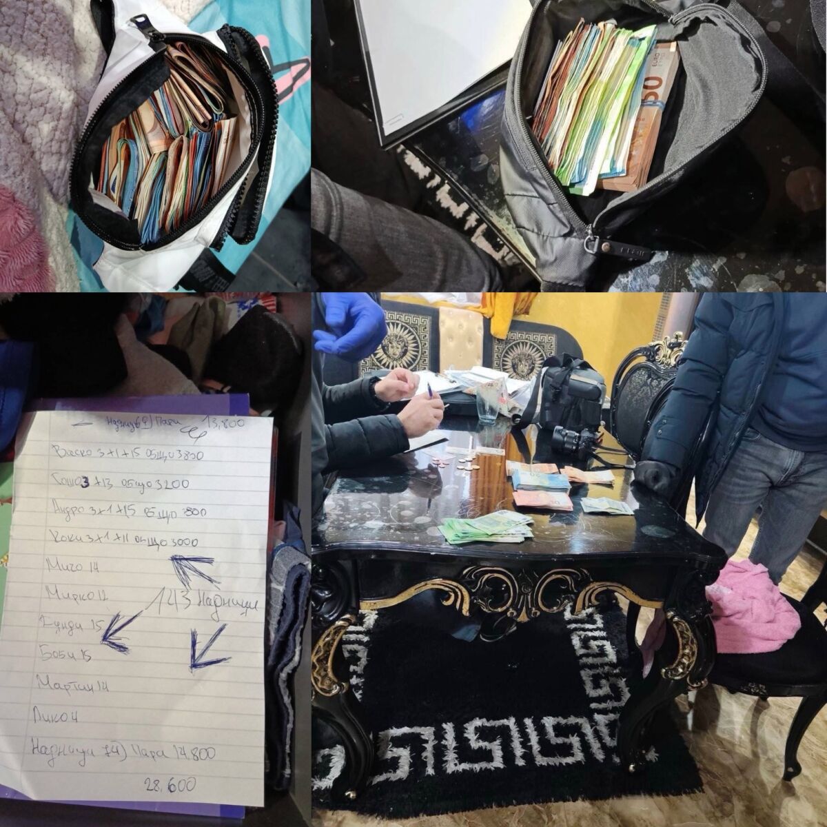 При процесуално-следствените действия са открити и иззети три списъка и един тефтер със записани имена и суми, както и парична сума в размер на около 53 000 евро. Задържани са седем лица.